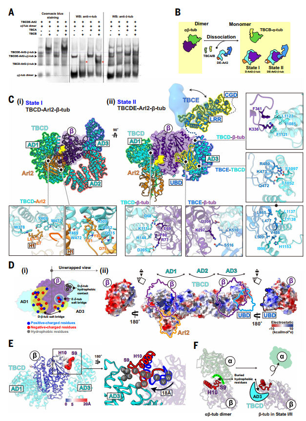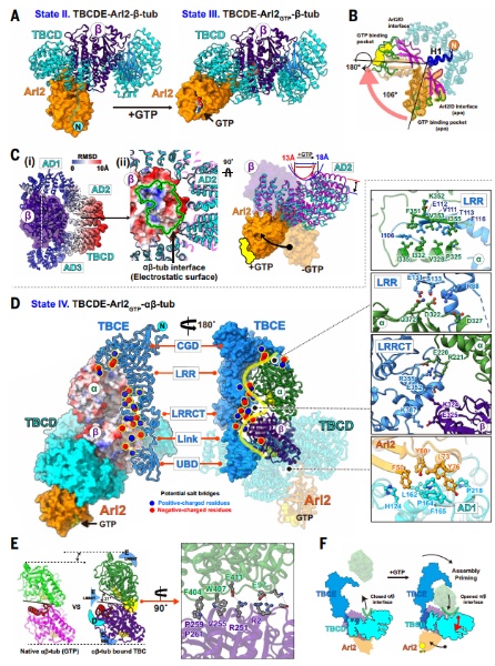 在无GTP条件下,复合物处于State I(TBCD–Arl2–β-微管蛋白)和State II(TBCDE–Arl2–β-微管蛋白)。此时α-微管蛋白完全解离,仅β-微管蛋白被解析,其通过静电互补作用被稳定。