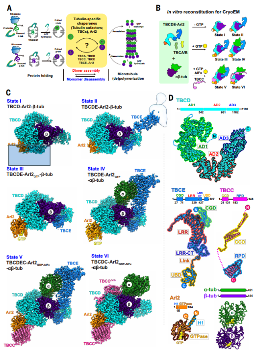 研究团队从哺乳动物细胞中纯化了人源TBCDE–Arl2复合物及TBCC,并在大肠杆菌中表达TBCA和TBCB。在特定GTP条件下,将上述组分与αβ-微管蛋白重组,成功获得六个结构状态的高分辨率冷冻电镜结构(分辨率为2.1–2.5 Å)。