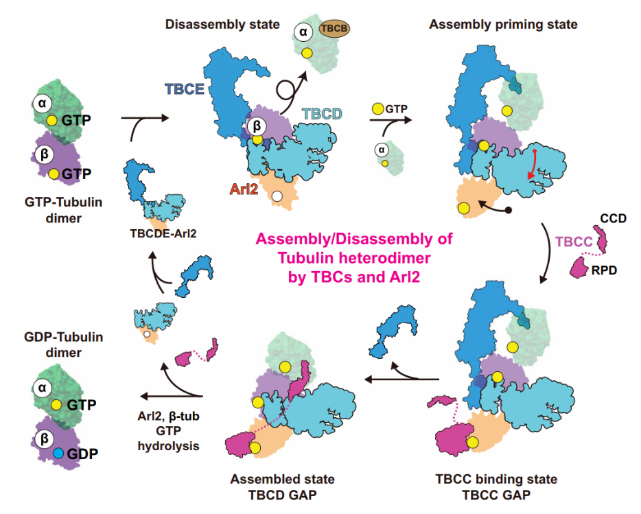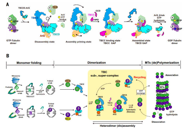 微管蛋白由 αβ-微管蛋白异二聚体构成,其组装与解聚过程依赖于一类称为 微管蛋白结合辅助因子(TBCs)的伴侣蛋白,包括 TBCA、TBCB、TBCC、TBCD、TBCE;此外,小GTP酶Arl2也参与调控该过程。