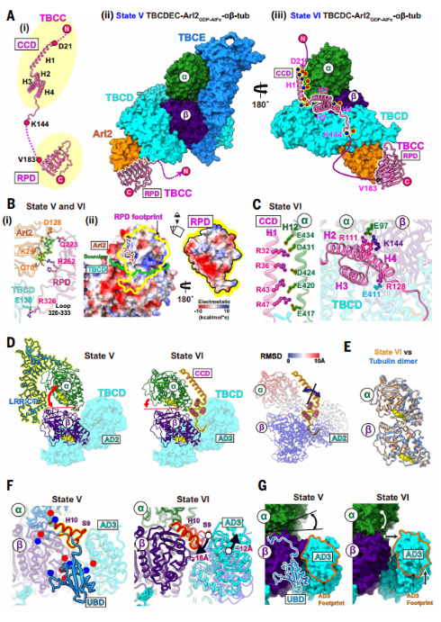 研究进一步利用GTP-AlFx模拟GTP水解后状态,发现TBCC通过两个结构域分步发挥作用:在State V中,其调控结构域(RPD)结合Arl2的GTP结合位点,辅助其GTP酶活性;在State VI中,TBCC的卷曲螺旋结构域(CCD)作为“分子夹子”桥连α/β-微管蛋白,同时促使TBCE解离,使异源二聚体形成天然界面,完成组装。