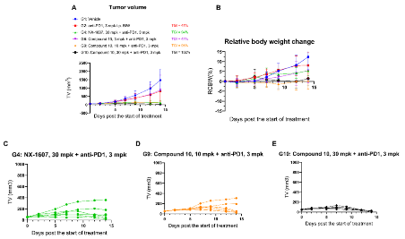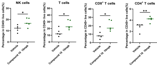化合物10口服生物利用度较 NX-1607 显著提高,清除率更低、全身暴露量(AUC)更高,且肿瘤 / 血浆浓度比达 1.3–1.7,显示出更优的肿瘤靶向性。药效学显示其可剂量依赖地调控 CBLB 响应基因签名,并增加瘤内 CD8⁺T 细胞与 NK 细胞浸润。暴露-效应关系表明,当化合物 10 的游离血浆浓度达 IL-2 EC₅₀(187 nM)以上时,即产生明显抗肿瘤作用,这一紧密 PK/PD 关联为其临床开发提供了量化依据。