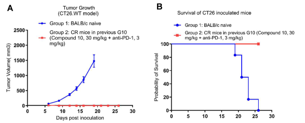 图5. 化合物10在CT26小鼠模型再挑战实验中的体内药效