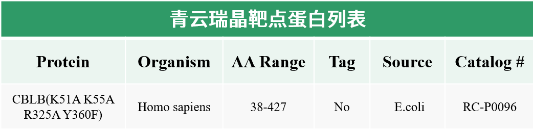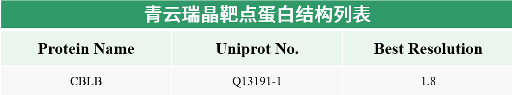 青云瑞晶针对CBLB蛋白完成了38-427(包含TKB、LHR、RING三个结构域)片段的表达、纯化和结晶,针对该靶点及其抑制剂的共晶结构也累积了丰富的数据。同时储备了Cbl-b通路上下游相关靶点蛋白的表达、纯化和结晶经验,可将项目的交付时间缩短至1-2个月,并确保项目的成功交付,满足企业药物研发需求。