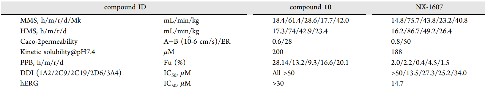 表4. 化合物 10 与 NX-1607 的体外 ADMET 特性对比