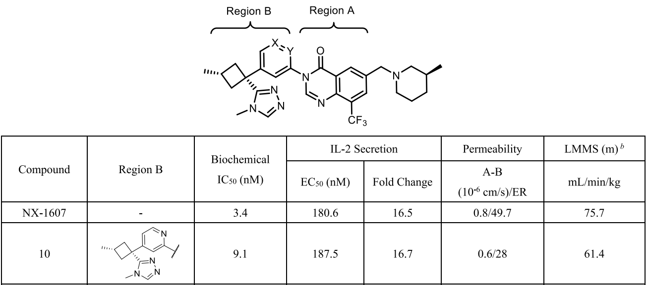 基于上述结构信息,团队系统优化了Region A(核心骨架)和Region B(三唑部分),通过引入氮原子、调整环大小及优化疏水相互作用等方式,最终获得了化合物10。该化合物活性与NX-1607相当,且膜通透性与代谢稳定性进一步改善。