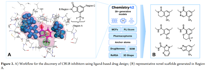 图2. A) 基于配体的药物设计方法发现 CBLB 抑制剂的工作流程;(B)A区(核心骨架区域)生成的代表性新型骨架