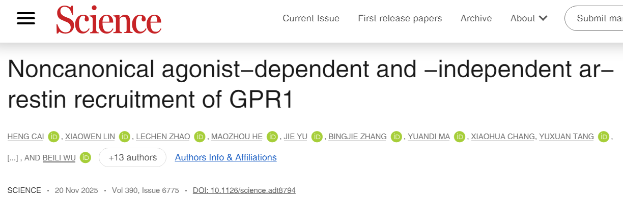 近日,上海药物所/杭高院吴蓓丽团队、临港实验室朱亚团队、上海药物所赵强、谢岑团队和上科大水雯菁团队合作在Science上发表了题为“Noncanonical agonist-dependent and -independent arrestin recruitment of GPR1”的研究文章。