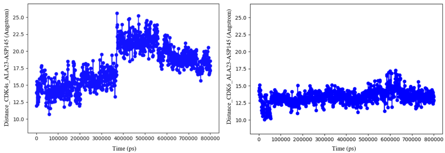 图7. CDK4s Ala23-Asp145(cl.77,左)和CDK6-Ala23-Asp1.45(g.I.9,右)之间距离的时间序列