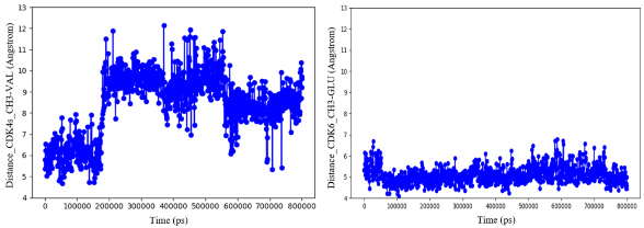 图6. 4(PF-07220060)的甲基与Val21(CDK 4s,左)或Glu21(CDK6,右)之间距离的时间序列