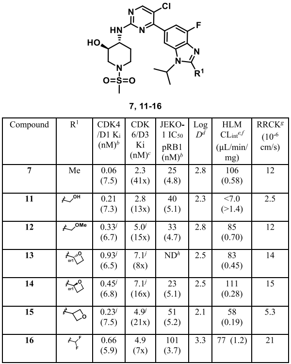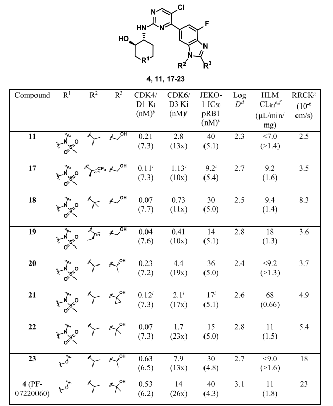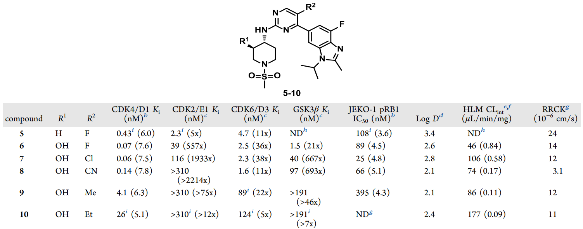 团队通过内部化合物库筛选,确定化合物5为初始优化起点。化合物5虽然具备一定活性(CDK4 Ki = 0.43 nM)和 CDK6 选择性(11倍),但对 CDK2 缺乏选择性(仅5倍),无法满足临床安全性需求。