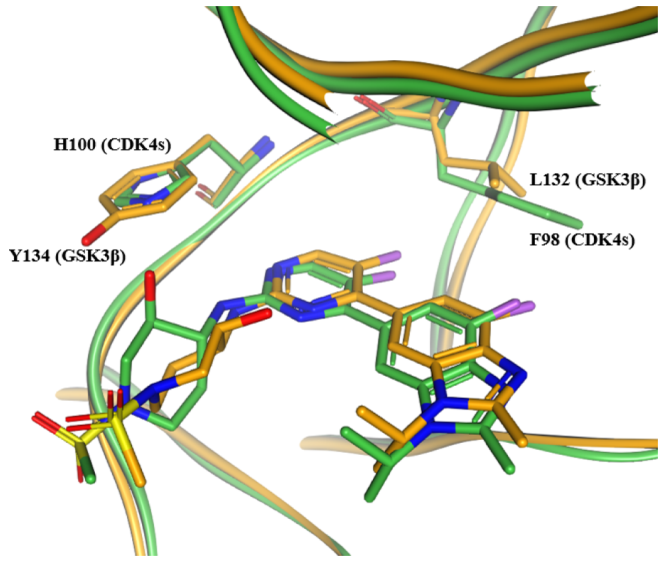 图3. 化合物6在CDK4s(绿色,PDB:9PE7)与GSK3β(橙色,PDB:9PE9)中的共晶结构叠加图