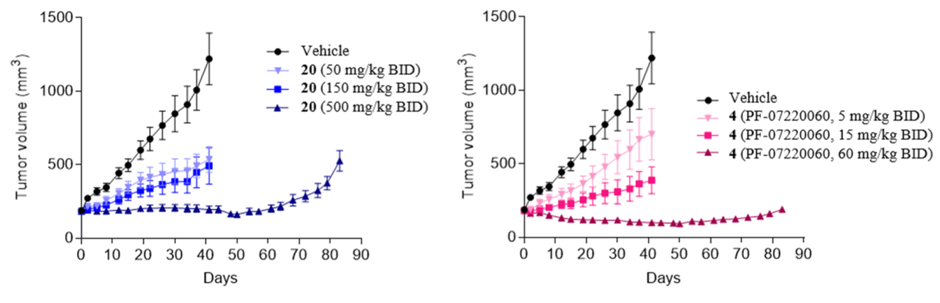 图8. 使用增加剂量的20与4对ZR75-1 HR+ HER2-乳腺癌异种移植物的肿瘤生长抑制