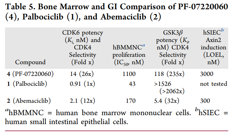 表5. PF-07220060(4)、Palbociclib(1)和Abemaciclib(2)的骨髓和胃肠道比较