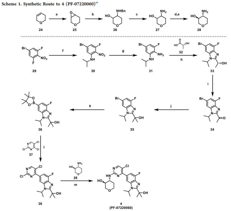 团队转而通过降低拓扑极性表面积(TPSA)以提高渗透性,将哌啶环改为四氢吡喃,得到化合物4(即最终的PF-07220060),其渗透性大幅提升,且代谢稳定性良好。