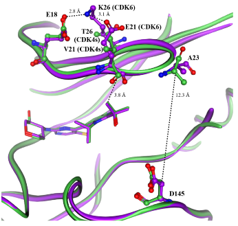 图5. 化合物4(PF-07220060)在CDK4s(绿色,PDB: 9PE8)和CDK6(紫色,PDB: 9D8U)中的共晶结构叠加图
