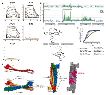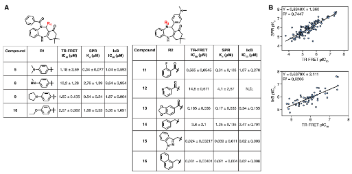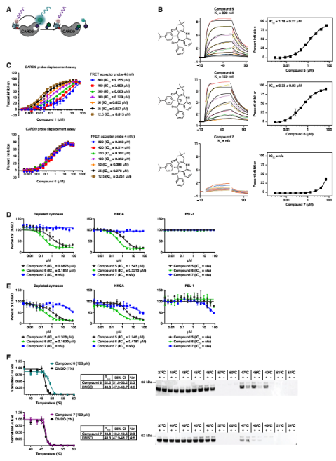 鉴于初始苯并咪唑结合剂不具备功能调节活性,团队创新性地建立基于时间分辨荧光共振能量转移(TR-FRET)的配体置换筛选平台:通过对约80万分子库的筛选与多轮验证,发现了一个苯二氮䓬类化合物系列。活性对映体化合物6能有效置换探针,且在SPR实验中显示与CARD9结合,而其对映体7则无活性。值得注意的是,苯二氮䓬化合物6的抑制活性不随探针浓度增加而改变,表现为非竞争性抑制模式,提示其可能通过变构机制发挥作用。