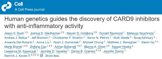 研究以“Human genetics guides the discovery of CARD9 inhibitors with anti-inflammatory activity”为题发表在《Cell》上。