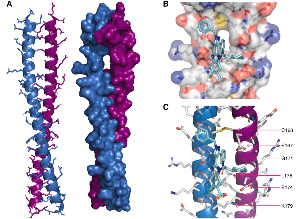 随后解析了CARD9K156-K214与化合物1的共晶结构(PDB:9AVN),首次揭示了小分子与卷曲螺旋域的结合模式,为靶向这个“不可成药”靶点提供了关键结构基础。