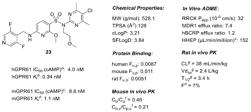 基于结构解析发现的修饰位点,针对化合物15血脑屏障穿透性差的短板,将仲磺酰胺转化为叔磺酰胺进行结构改造;经侧链优化得到化合物23,其保持强效的GPR61 抑制活性,且MDR1 外排率显著降低,小鼠体内血脑屏障穿透性大幅提升,成为可穿透血脑屏障的工具分子,同时发现该化合物存在代谢清除率高、口服生物利用度低的成药性问题。