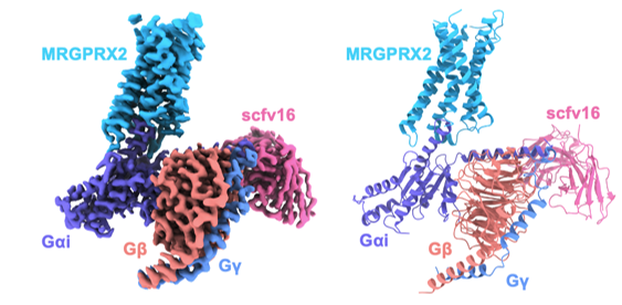 MRGPRX2是一种主要表达于皮肤肥大细胞的G蛋白偶联受体(GPCR),作为非IgE依赖性肥大细胞激活的关键介质,在新过敏反应分类中被定义为VII型过敏的分子基础。它能够被多种内源性物质(如神经肽P物质、抗菌肽LL-37)和外源性化合物(如阿片类药物)激活,通过Gq蛋白信号通路触发钙离子内流及肥大细胞脱颗粒,释放组胺等炎症介质,引起皮肤红斑、风团及瘙痒等症状。临床研究显示,在慢性自发性荨麻疹和特应性皮炎等疾病中,MRGPRX2及其配体(如LL-37)的表达水平显著升高,且与疾病严重程度正相关,凸显其在过敏性炎症疾病中的重要病理作用。
