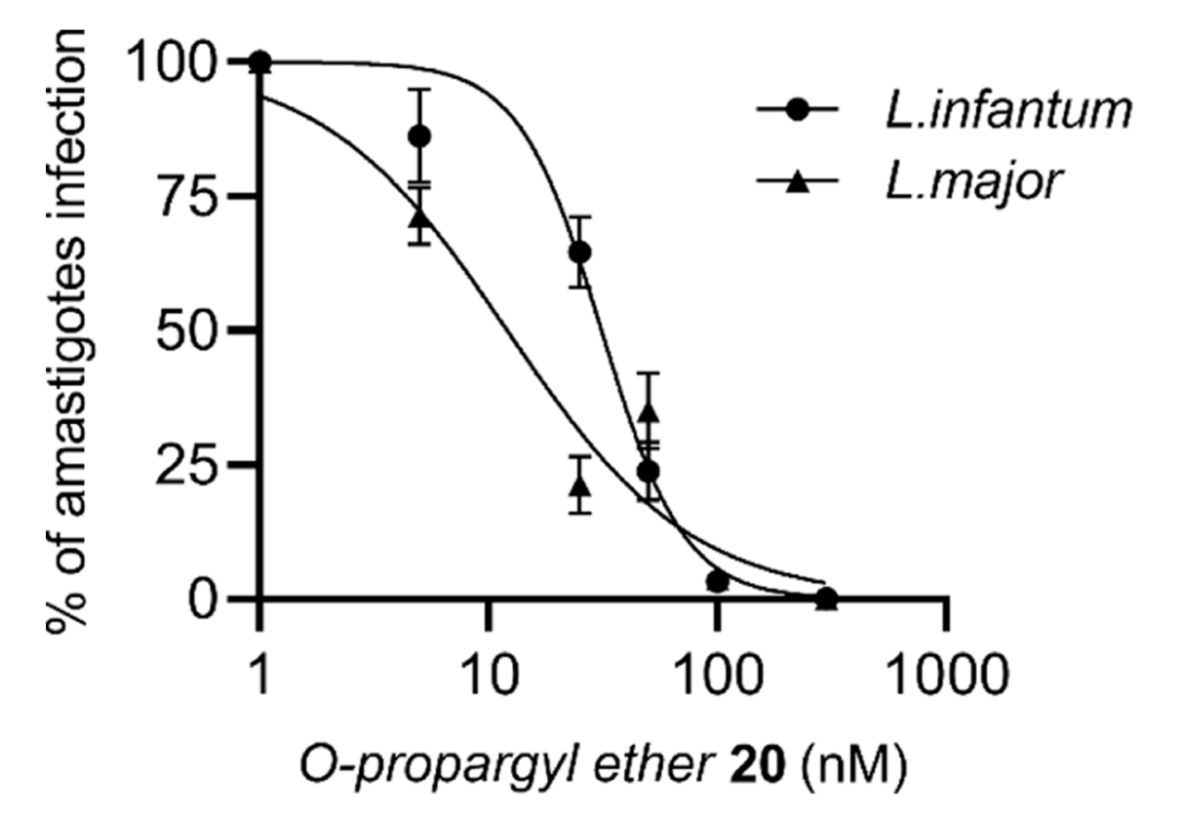 表1. 茴香霉素及其O-取代类似物在25°C下对不同利什曼原虫前鞭毛体株的结构、生物活性(EC50)和细胞毒性(CC50),并监测72小时后寄生虫增殖情况