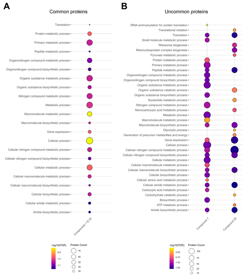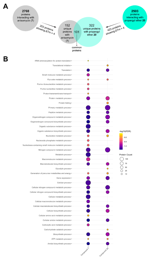 图4. 通过热蛋白质组学分析(TPP),鉴定了茴香霉素(7)和O-炔丙基醚(20)在婴儿利什曼原虫前鞭毛体中全蛋白质组范围内的作用靶点。