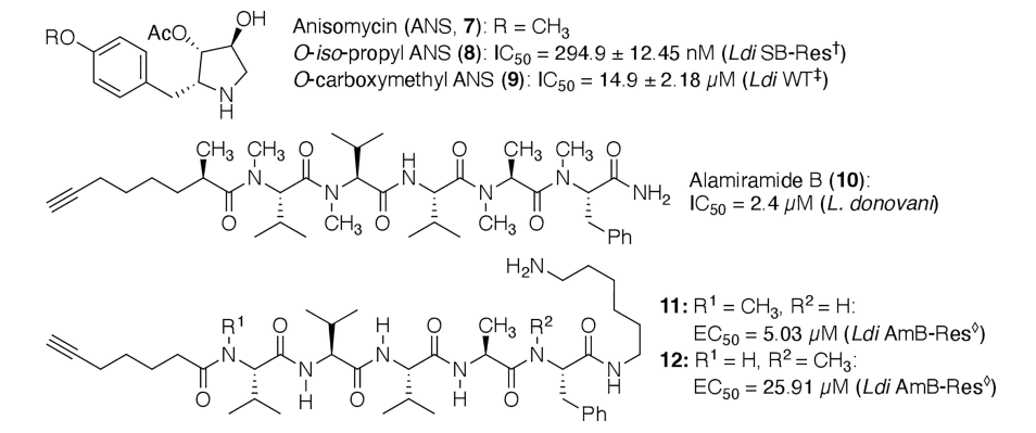 图1. Anisomycin (7), almiramide (10), and derivatives 8, 9, 11, and 12.