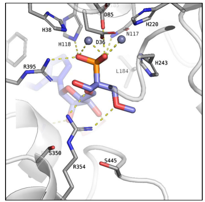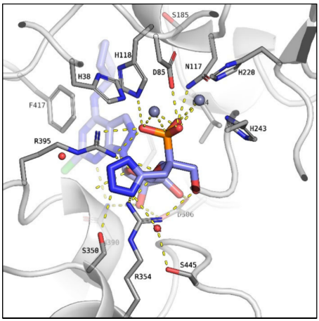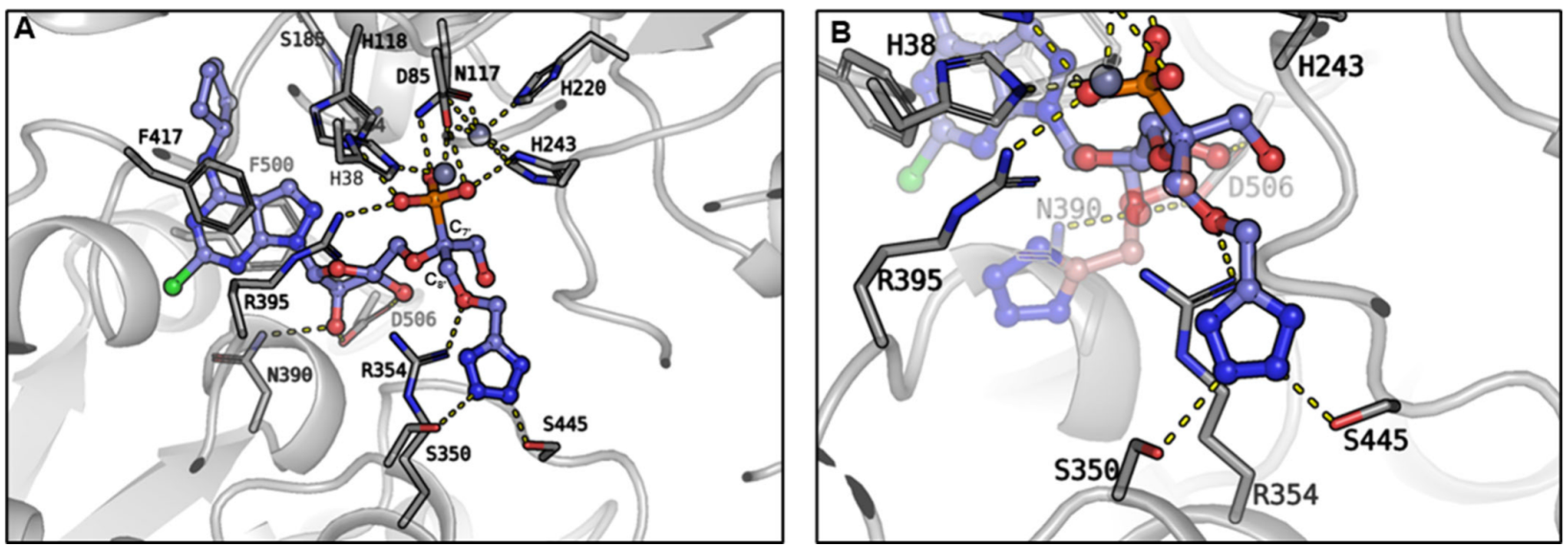单膦酸系列口服利用度提升,但效力下降。研究人员分析了化合物4(单膦酸先导物)与CD73的共晶结构(图4, PDB 7JV8),发现α-立体中心附近的S350和S445残基处于一个“空腔”中,可以被新的官能团靶向。
