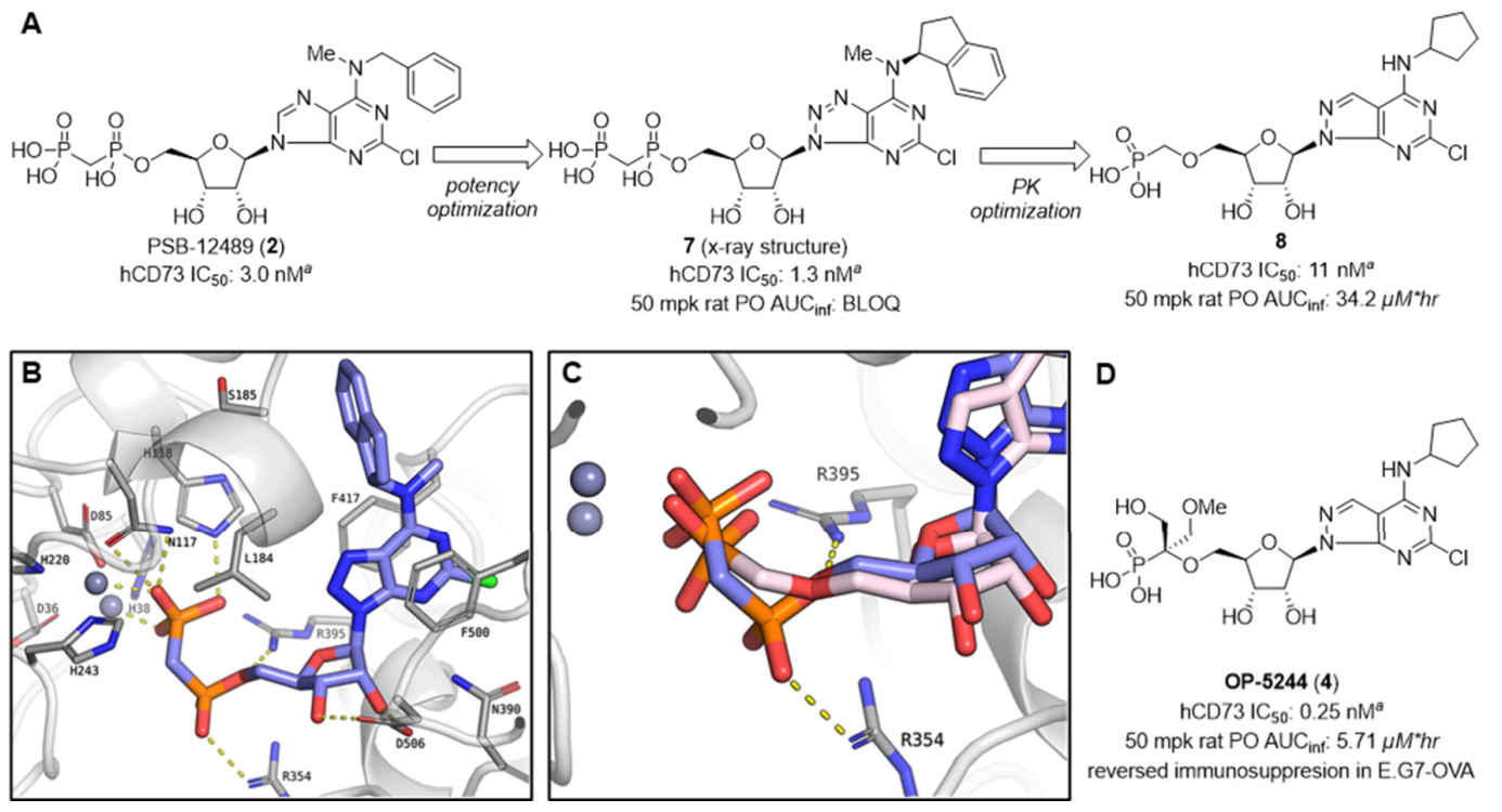 1)提高口服吸收:传统 CD73 抑制剂(如化合物7)含双膦酸基团,极性过高导致口服吸收差。研究团队通过观察化合物7与CD73的共晶结构(图3B, PDB 9R0D),去除其中一个膦酸基团,保留单膦酸结构,同时在 α 位引入羟甲基 / 甲氧基甲基取代基,降低分子极性,提升口服生物利用度(如化合物8首次实现啮齿类动物口服暴露)。