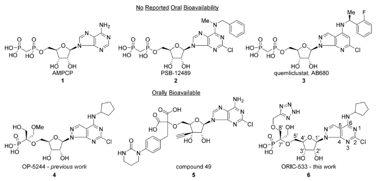 图2. CD73抑制剂。文献中报道的AMPCP (1)及其他基于腺苷结构的小分子CD73抑制剂(2)和(3)均不具备口服生物利用度;近期报道的化合物(4)和(5)虽展现一定口服生物利用度,但仍未完全达到开发候选药物所需的所有特性。