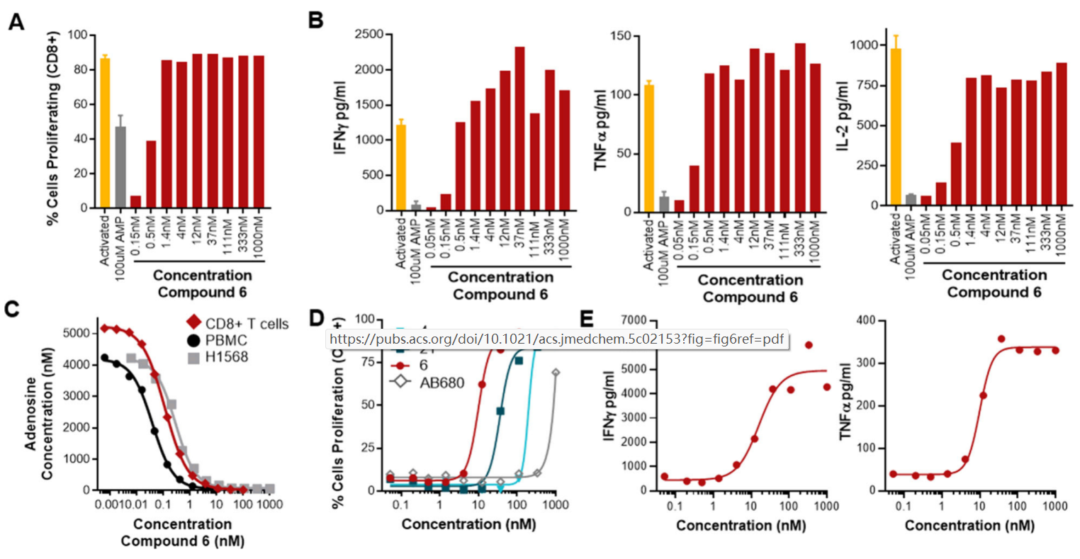 化合物6在低纳摩尔浓度下能够恢复T细胞的激活和细胞因子的产生,显示出强大的免疫调节活性。此外,化合物6在高AMP环境下仍能有效恢复T细胞增殖与细胞因子分泌。