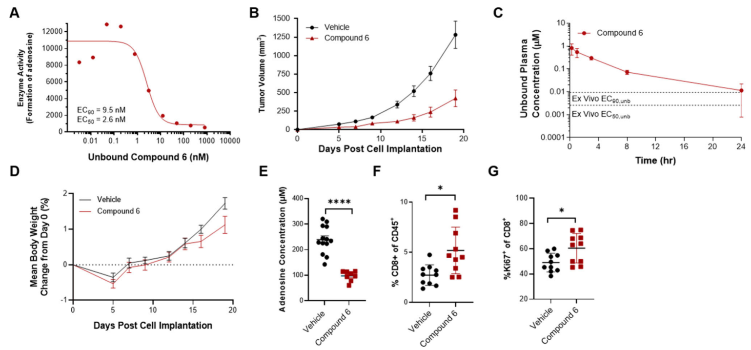 在小鼠的同种异体肿瘤模型中,口服给药的化合物6能够减少肿瘤中的ADO浓度,增加CD8+ T细胞浸润数量,并抑制肿瘤生长。