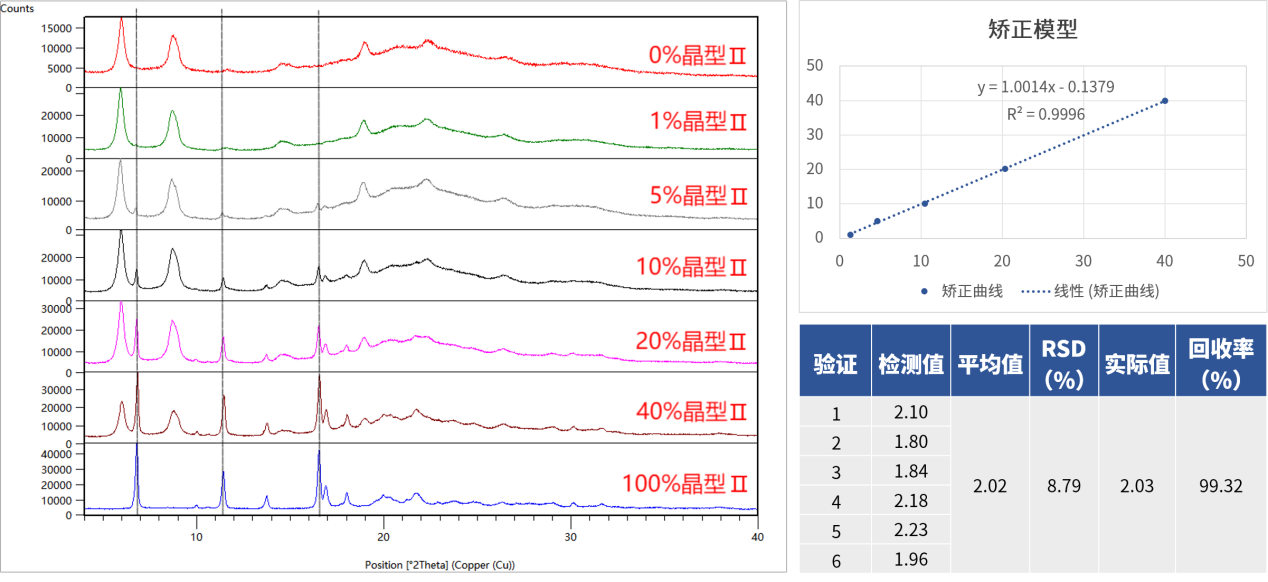 针对这个难题,我们通过优化制样与扫描参数,成功建立了基于特征峰的PXRD定量方法。通过配制0%~100%的梯度样品,我们绘制出线性优良的校正曲线(R² = 0.9996),并完成了全面方法学验证。该方法有效测定了低至1%的杂质晶型Ⅱ,RSD符合要求,最终成功助力企业完成该原料药的注册申报。