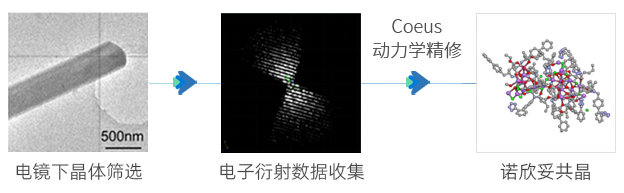 我司接到样品之后,直接从样品粉末中挑出合适的微晶颗粒,将最小尺寸只有几百纳米的晶体放在冷冻透射电镜中,使用MicroED进行数据收集和结构解析,最终获得了该共晶药物的结构,并协助该家企业完成药物上市申报工作。