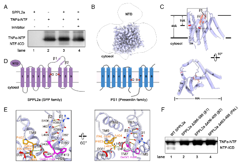 研究通过解析3.3 Å 的SPPL2a冷冻电镜结构图,发现其具有9个跨膜螺旋(TM1–TM9);