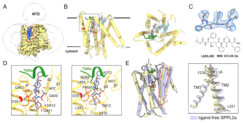 解析SPPL2a与抑制剂L685,458结合的3.6 Å结构显示,抑制剂分子嵌入两个催化天冬氨酸之间,通过氢键与疏水作用被精确识别。抑制剂结合诱导了显著构象重排:原本柔性的 TM2 向活性位点移动约 2.4 Å,同时 TM6 区域在胞外端形成一段新的短螺旋 TM6a,覆盖于抑制剂上方,使整体结构更为紧凑。