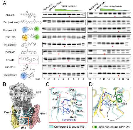 通过测试多种已知抑制剂,发现化合物E、BMS906024、LY411575等对γ-分泌酶的抑制效力远高于对SPPL2a。进一步解析化合物E与γ-分泌酶的复合物结构(2.9 Å)表明,该抑制剂两端基团与PS1的TM6a紧密作用。结构叠合显示,相同基团会与SPPL2a的TM6a发生空间冲突,从而在物理上阻碍其有效结合,从原子层面解释了选择性抑制的机制。