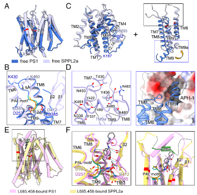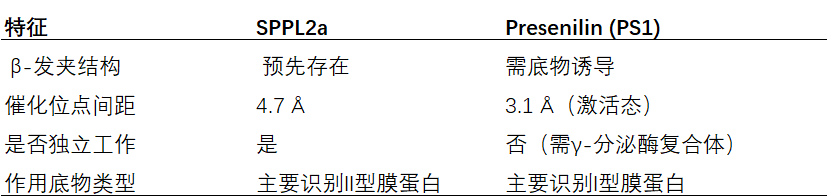 在无底物/抑制剂时,SPPL2a活性位点附近已存在一个反平行β-发夹结构。这与早老素1(PS1)不同,后者仅在底物/抑制剂结合时才形成类似结构,这可能解释了SPPL2a不依赖于其他辅助亚基的活性;