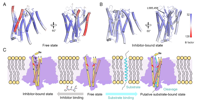 图2. 抑制剂结合引发SPPL2a的结构变化