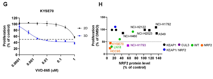 在三维培养(3D球体)模型中,VVD-065能有效抑制NRF2依赖性癌细胞的增殖,且该抑制效果与化合物降低NRF2蛋白水平的能力高度相关,证实了其作用的靶点特异性。