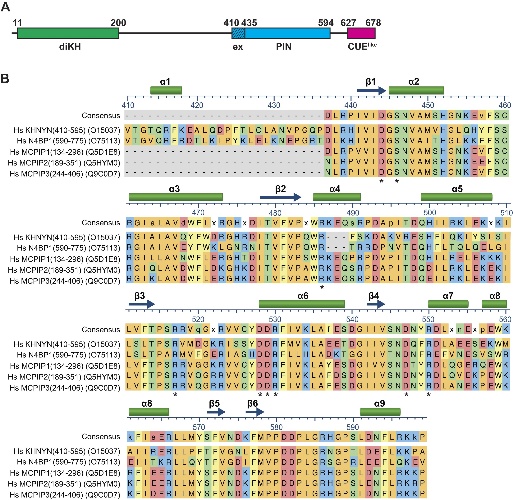 通过AlphaFold与多序列比对,发现KHNYN较ZC3H12家族多出一段N端延伸(V410–Q434)。构建核心PIN与扩展PIN表达体系,发现仅后者可溶且单分散,说明N端结构臂是蛋白稳定的关键。