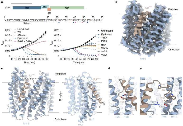 目前已知仅有的革兰氏阴性菌 MurJ 抑制剂是来自单链 RNA 噬菌体M和PP7的单基因裂解蛋白 (Sgls),分别称为 Sgl™ 和 SglPP7 。解析这些天然噬菌体抑制剂与MurJ的作用机制,不仅有助于理解噬菌体-宿主的进化博弈,更为开发靶向MurJ的新型抗菌药物提供了宝贵的结构线索。