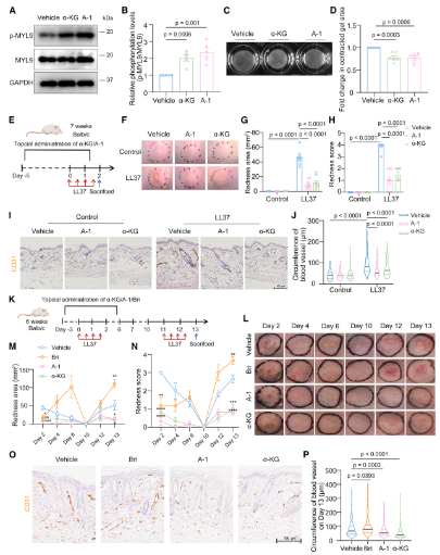 图3. α-KG-OXGR1-MYL9 轴阻止玫瑰痤疮的异常血管舒张