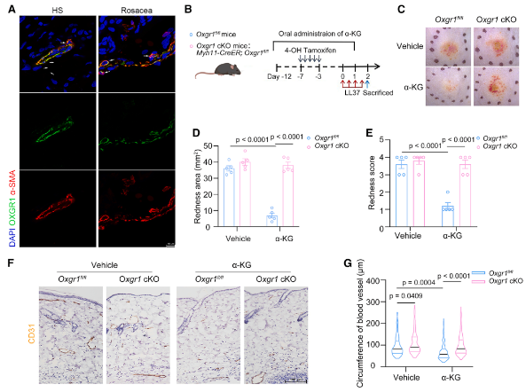 α-KG 可特异性激活 G 蛋白偶联受体 OXGR1,该受体仅定位于血管平滑肌细胞;进一步构建血管平滑肌细胞特异性 OXGR1 敲除小鼠后,α-KG 的玫瑰痤疮保护作用完全消失。此外,OXGR1 的另一内源性激动剂 ITA 也能通过激活该受体改善小鼠玫瑰痤疮表型,确认OXGR1是介导α-KG改善玫瑰痤疮的核心功能受体。