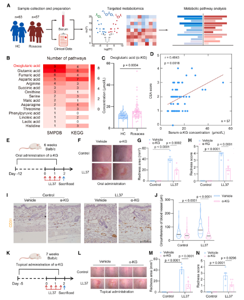 研究团队首先通过比较玫瑰痤疮患者与健康对照者的血清代谢组,发现患者血清中α-酮戊二酸(α-KG)水平显著升高,提示其可能是调控玫瑰痤疮红斑表型的关键内源性代谢物。