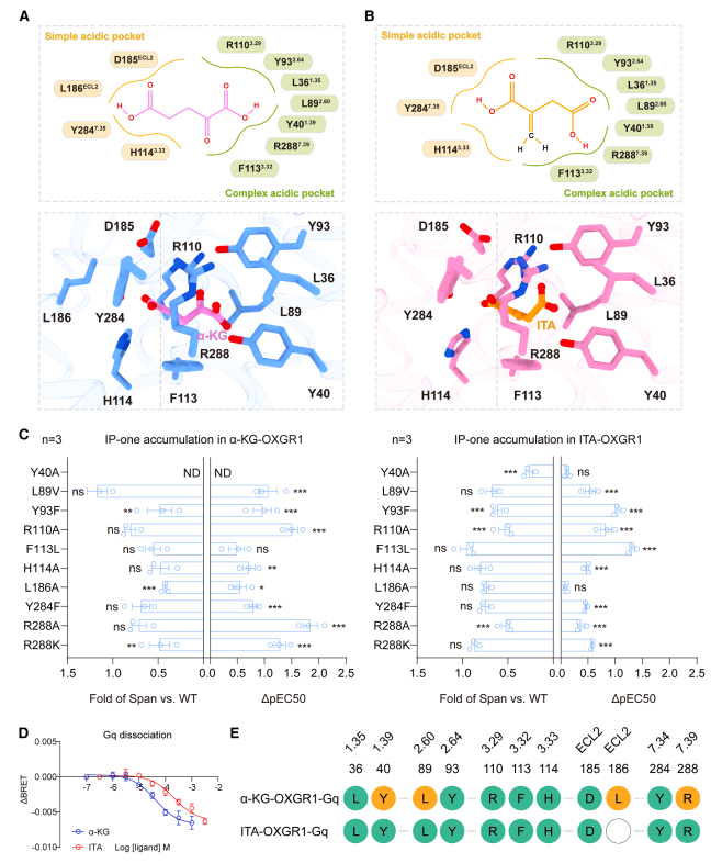 为从分子层面阐明OXGR1的活化机制,研究团队利用冷冻电镜技术,首次解析了OXGR1与α-KG及ITA结合的高分辨率结构。结构显示,OXGR1拥有一个区别于经典GPCR的独特双酸识别口袋,明确了受体与配体相互作用的关键氨基酸位点,为后续基于结构的药物设计奠定了坚实基础。