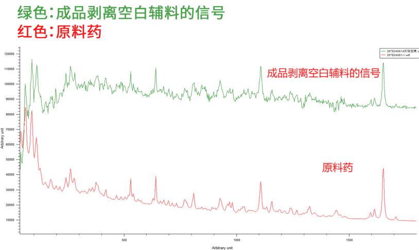 3. 将制剂成品谱图剥离空白辅料信号。因为原料药占比极少,收集到的初始图谱几乎全是辅料的信号。我们将制剂的整体光谱图与“空白辅料光谱图”进行光谱扣除,让庞大的乳膏基质信号“隐身”,最终得到活性成分的信号;