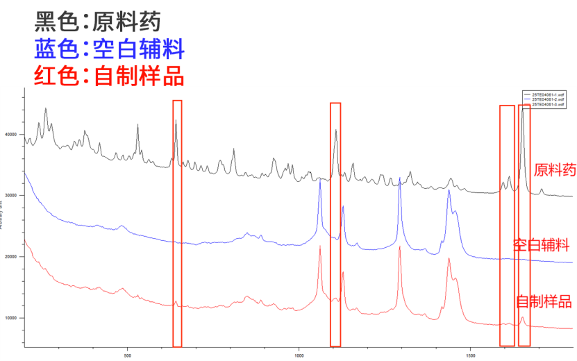 4. 最后,我们将得到的活性成分信号与原料药图谱进行重叠对比,发现核心特征峰无论是位置还是形状都与原料药特征峰基本一致。