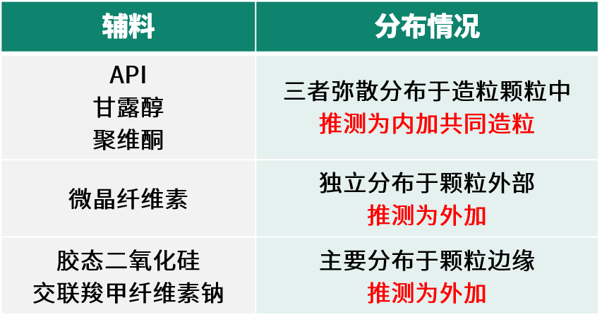对于口服固体制剂,尤其是湿法制粒工艺的制剂,辅料的添加时机(内加/外加),直接决定了其在制剂中的空间分布与功能发挥。而传统的逆向分析方法均为间接推测,无法直观获取辅料在制剂中的空间分布信息,极易出现误判,给处方开发埋下巨大的风险隐患。