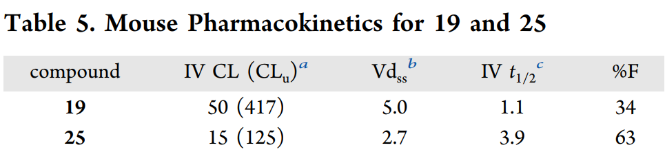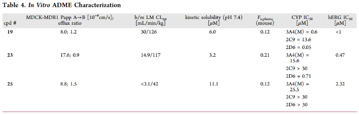 针对19的CYP抑制与hERG毒性问题,团队将吡啶弹头改为哒嗪、碱性胺改为中性氧杂环丁烷,得到代谢稳定性、口服生物利用度及中枢渗透能力更佳的优化分子25。